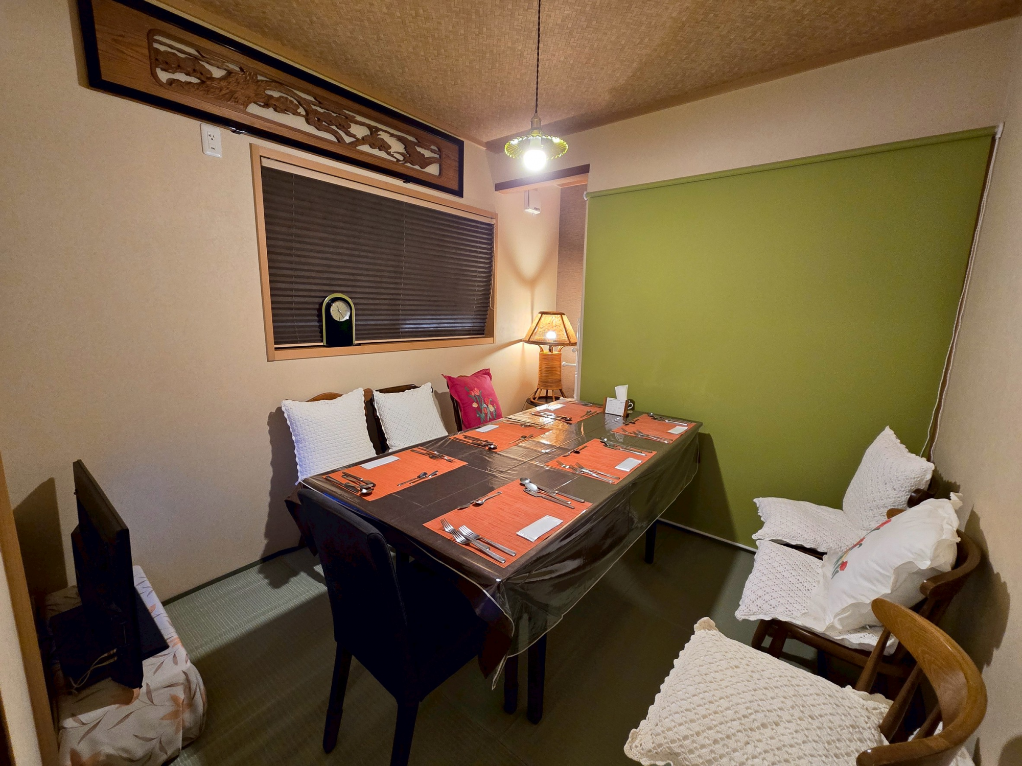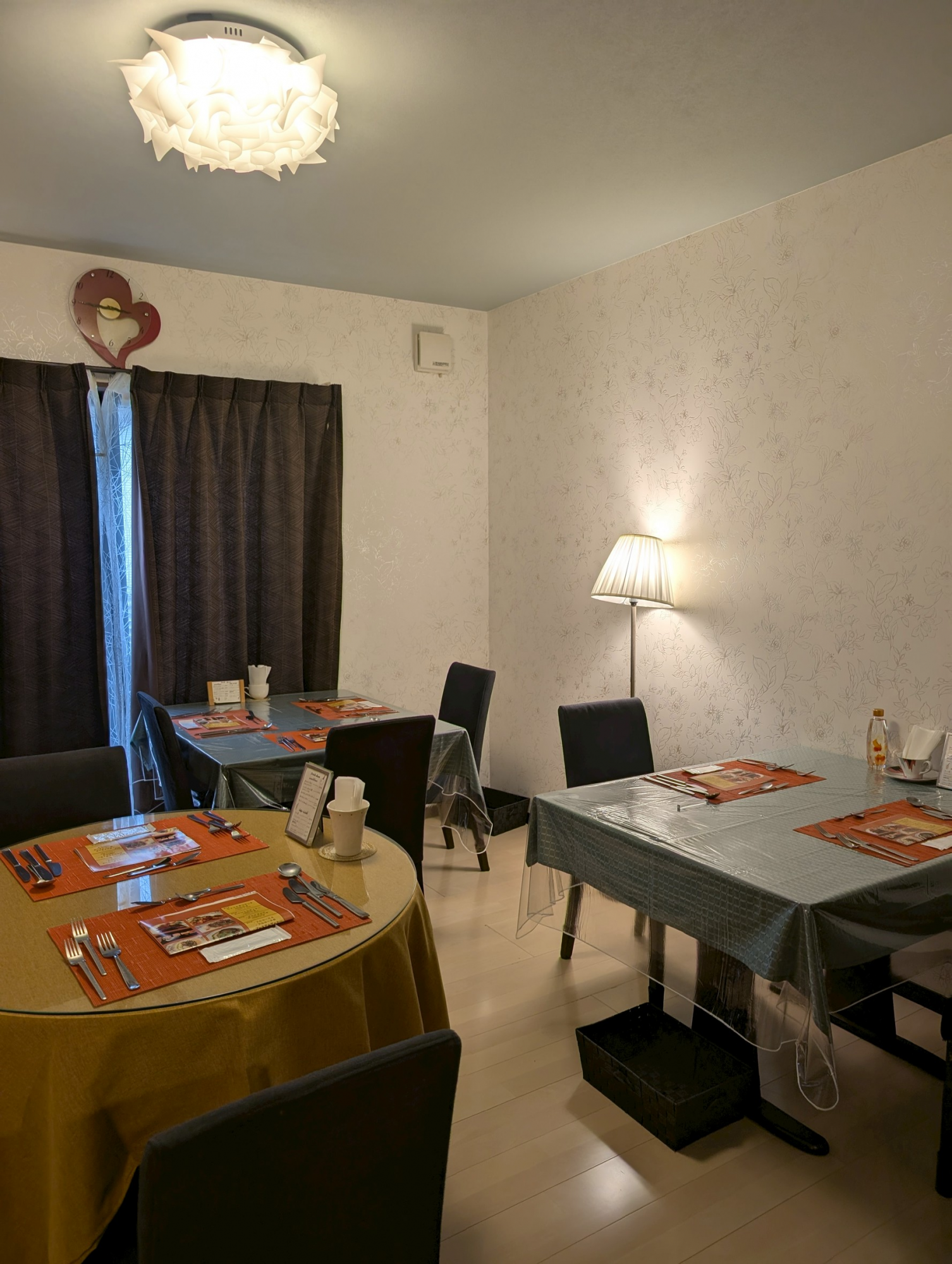 一方、客席は落ち着いて食事ができるよう、温かみのある壁紙でコーディネートしております。